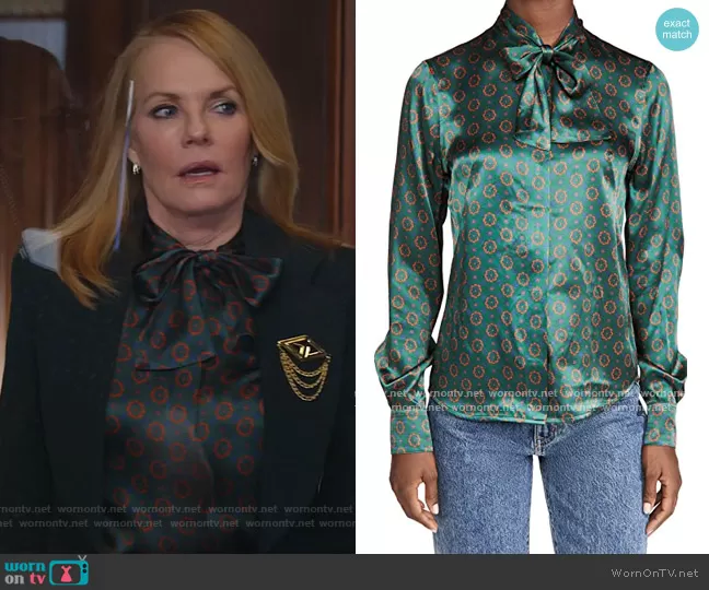 Lisa Benner (played by Marg Helgenberger) on All Rise on OWN was spotted wearing this green floral tie neck blouse on All Rise on episode 'Hear My Voice' (2x15) in May 2021. Lisa's Top is the Tie Neck Silk Shirt by Victoria Beckham.