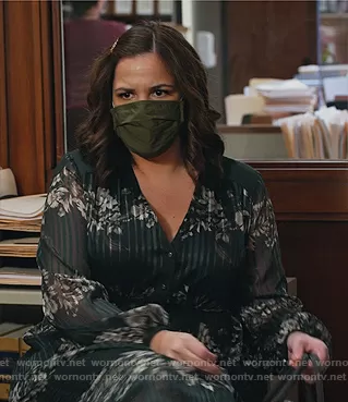 Sara Castillo (played by Lindsay Mendez) on All Rise on OWN was spotted wearing this green floral pleated dress on All Rise on episode 'A Change Is Gonna Come' (2x01) in Nov 2020. Sara's Dress is the Delyla Meadowsweet Long Sleeve Midi Dress by Ted Baker.