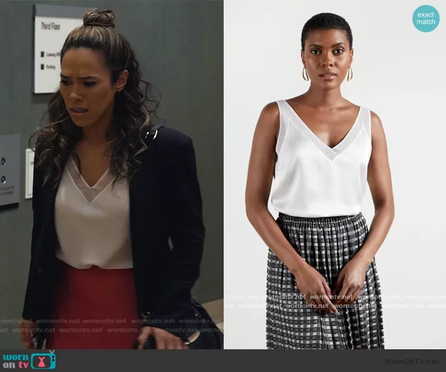 Emily Lopez (played by Jessica Camacho) on All Rise on OWN was spotted wearing this white v-neck mesh trim cami on All Rise on episode 'A Change Is Gonna Come' (2x01) in Nov 2020. Emily's Top is the Lilyane Top by Ted Baker.