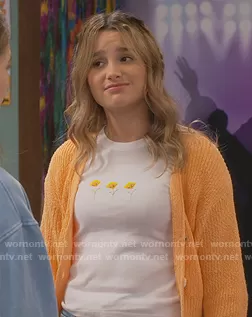 Lex (played by Jules LeBlanc) on Side Hustle on Nickeldeon was spotted wearing this orange cardigan and floral tee on Side Hustle on episode 'Vitamin D-isaster' (1x02) in Nov 2020. Lex's Top is the Floral Top by Brandy Melville . Lex's Sweater is the Kennedy Ribbed Cropped Cardigan by Urban Outfitters.