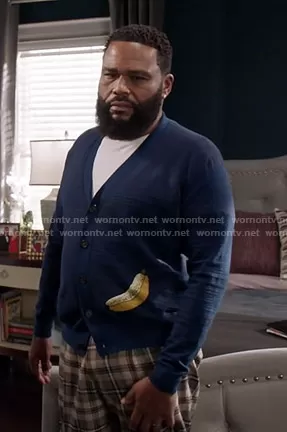 Andre Johnson (played by Anthony Anderson) on Black-ish on ABC was spotted wearing this navy banana print cardigan on Black-ish on episode 'Our Wedding Dre' (7x06) in Nov 2020. Andre's Sweater is the Banana Jacquard Cardigan by Acne Studios.