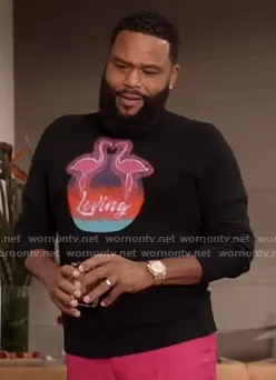 Andre Johnson (played by Anthony Anderson) on Black-ish on ABC was spotted wearing this black flamingo print sweater on Black-ish on episode 'Our Wedding Dre' (7x06) in Nov 2020. Andre's Sweater is the Palm Long-Sleeve Sweater by Valentino.