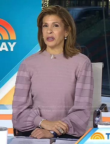 Hoda Kotb on Today on NBC was spotted wearing this pink striped sleeve top on Today on Aug 26 2022's episode. Hoda's Sweater is the Woven Sleeve Sweater by Club Monaco.