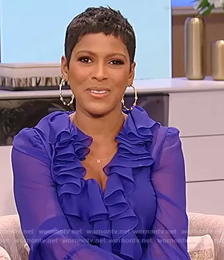 Tamron Hall on Tamron Hall Show on ABC was spotted wearing this blue sheer ruffle dress on Tamron Hall Show on Nov 20 2020's episode. Tamron's Dress is the Ruffle Trim Sheer Silk Duster by Saint Laurent.