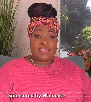 Loni Love on The Real on BETher was spotted wearing this pink bobble sweater on The Real on Nov 20 2020's episode. Loni's Sweater is the Bauble Sweater by Eloquii.