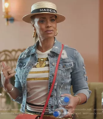 Gizelle Bryant on The Real Housewives of Potomac on Bravo was spotted wearing this denim distressed jacket on The Real Housewives of Potomac on episode 'Fifty Shades of Betrayal' (5x17) in Nov 2020.