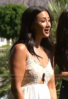 on The Bachelorette on ABC was spotted wearing this white lace cutout mini dress on The Bachelorette on episode 'Week 7' (16x07) in Nov 2020. 's Dress is the Bryce Mini Dress by Tularosa.