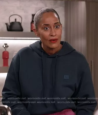Rainbow Johnson (played by Tracee Ellis Ross) on Black-ish on ABC was spotted wearing this navy hoodie on Black-ish on episode 'Babes in Boyland' (7x07) in Nov 2020. Rainbow's Sweater is the Ferris Face Hoodie by Acne Studios.