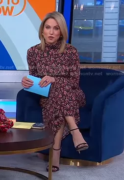 Amy Robach on Good Morning America on ABC was spotted wearing this black floral mock neck dress on Good Morning America on Nov 26 2020's episode. Amy's Dress is the Heidi Printed Bodycon Dress by Ramy Brook.