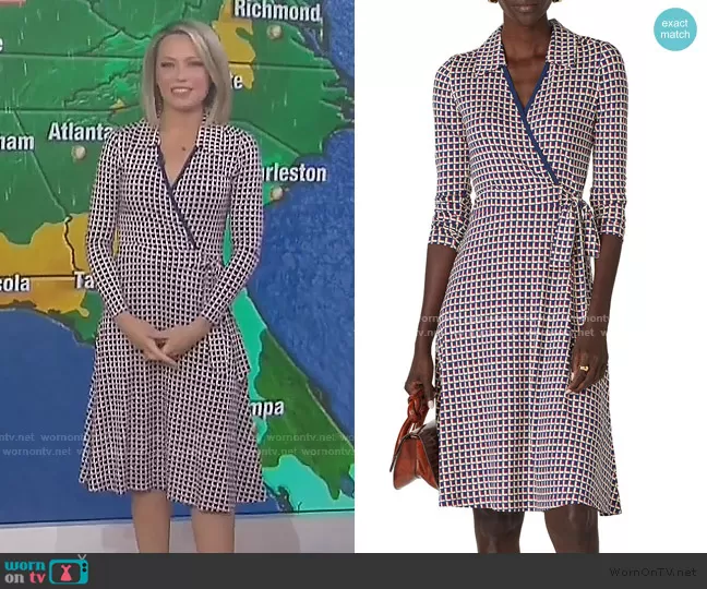 Dylan Dreyer on Today on NBC was spotted wearing this geometric print wrap midi dress on Today on Nov 26 2020's episode. Dylan's Dress is the Dr Nora Wrap Dress by LK Bennett.