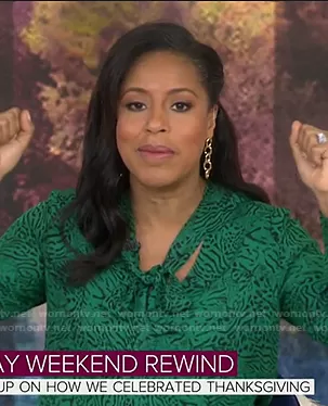 Sheinelle Jones on Today on NBC was spotted wearing this green animal print tie neck dress on Today on Nov 30 2020's episode. Sheinelle's Dress is the Mercer Animal Print Dress by Parker.