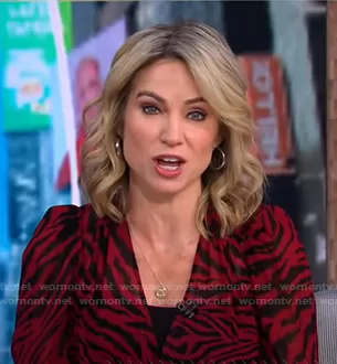 Amy Robach on Good Morning America on ABC was spotted wearing this red zebra print dress on Good Morning America on Nov 30 2020's episode. Amy's Dress is the Saphir Zebra-Print Long-Sleeve Short Dress by Ba&Sh.