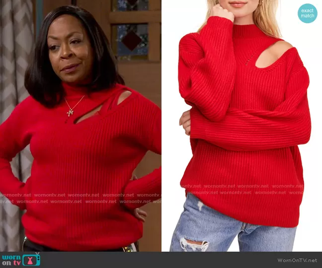 Tina Butler (played by Tichina Arnold) on The Neighborhood on CBS was spotted wearing this red cutout sweater and sequin stripe pants on The Neighborhood on episode 'Welcome to Couples Therapy' (3x03) in Dec 2020. Tina's Sweater is the Cutout Turtleneck Sweater by ASTR . Tina's Pants is the Sequined-Stripe Cropped Track Pants by Pam & Gela.
