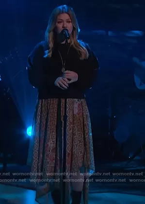 Kelly Clarkson on The Kelly Clarkson Show on NBC was spotted wearing this patchwork asymmetric skirt on The Kelly Clarkson Show on Dec 01 2020's episode. Kelly's Skirt is the Stay Awhile Print Handkerchief Skirt by Free People.