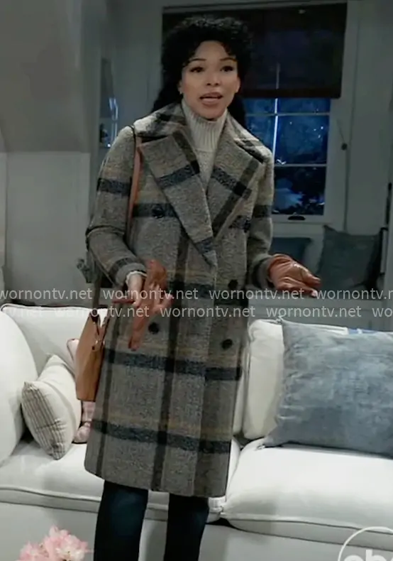On GH, Portia recently showcased her impeccable sense of style with a grey plaid double-breasted coat by Kendall + Kylie. This coat, with its simple and large check pattern, exudes a sense of timeless elegance and neutrality, making it a versatile and wearable piece for any occasion. The coat's understated design is both chic and functional, aligning perfectly with Portia's character, who often blends sophistication with practicality. Its neutral color palette allows it to be effortlessly paired with various outfits, highlighting Portia's flair for creating looks that are both fashionable and accessible. This checked coat not only accentuates Portia's gracefulness but also serves as a testament to her ability to choose attire that is as stylish as it is functional.