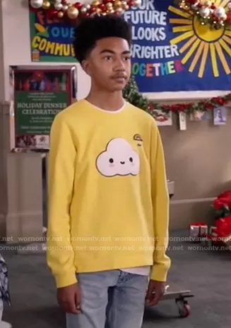 Jack Johnson (played by Miles Brown) on Black-ish on ABC was spotted wearing this yellow cloud patch sweatshirt on Black-ish on episode 'Compton Around the Christmas Tree' (7x08) in Dec 2020. Jack's Sweater is the Boys' Croc Logo Sweatshirt by Lacoste.