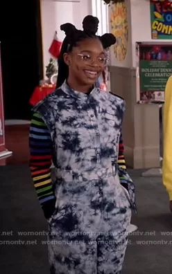 Diane Johnson (played by Marsai Martin) on Black-ish on ABC was spotted wearing this striped sweater and tie dye jumpsuit on Black-ish on episode 'Compton Around the Christmas Tree' (7x08) in Dec 2020. Diane's Sweater is the Rainbow-Stripe Sweater by Madeleine Thompson x AQUA . Diane's Jumpsuit is the Sleeveless Tie-Dye Jumpsuit by Rebecca Taylor.