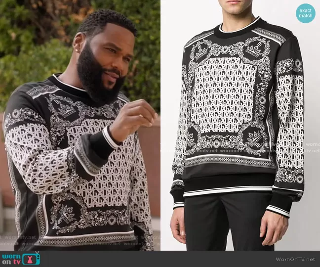 Andre Johnson (played by Anthony Anderson) on Black-ish on ABC was spotted wearing this black bandana print sweatshirt on Black-ish on episode 'Compton Around the Christmas Tree' (7x08) in Dec 2020. Andre's Sweater is the Bandana Print Sweatshirt by Dolce & Gabbana.