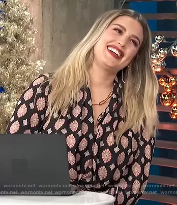 Carissa Loethen Culiner on E! News on E! was spotted wearing this black printed wrap blouse on E! News Daily Pop on Dec 02 2020's episode. Carissa's Top is the Shaila printed silk crepe de chine wrap top by Nicholas.