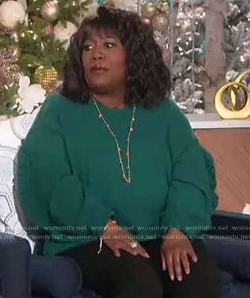 Sheryl Underwood on The Talk on CBS was spotted wearing this green ruffle trim sweater on The Talk on Dec 04 2020's episode. Sheryl's Sweater is the Ruffle Sleeve Sweatshirt by A New Day at Target.