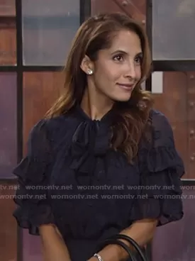 Lily Winters (played by Christel Khalil) on The Young and the Restless on CBS was spotted wearing this navy tie neck ruffled sleeve top on The Young and the Restless on Dec 04 2020's episode. Lily's Top is the Tulip Clip Silk-Blend Top by Rebecca Taylor.