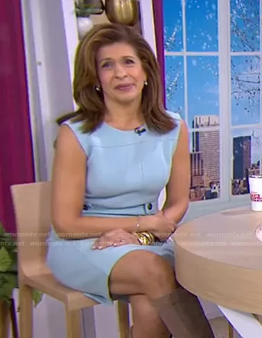 Hoda Kotb on Today on NBC was spotted wearing this light blue sleeveless dress on Today on Jun 29 2021's episode. Hoda's Dress is the Tabby Sleeveless Sheath Dress by Toccin.