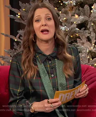 Drew Barrymore on The Drew Barrymore Show on CBS was spotted wearing this green plaid blouse on The Drew Barrymore Show on Dec 07 2020's episode. Drew's Top is the Harris Tartan Cowl Back Shirt by Monse . Drew's Skirt is the Midi Skirt in Wool Flannel by Celine.