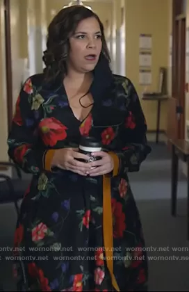 Sara Castillo (played by Lindsay Mendez) on All Rise on OWN was spotted wearing this black floral contrasting dress on All Rise on episode 'Bad Beat' (2x04) in Dec 2020. Sara's Dress is the Kobi Halperin Zula Floral Print Dress by Kobi Halperin.
