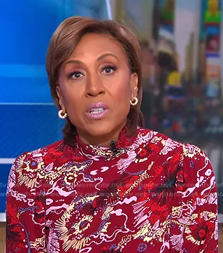 Robin Roberts on Good Morning America on ABC was spotted wearing this red floral mock neck dress on Good Morning America on Dec 08 2020's episode. Robin's Dress is the Isabella Floral Asymmetrical Maxi Dress by A.L.C..