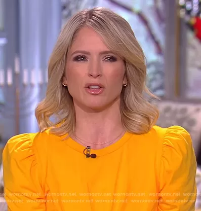 Sara Haines on The View on ABC was spotted wearing this yellow puff sleeve top on The View on Dec 08 2020's episode. Sara's Top is the Kati Puff-Sleeve Tee by A.L.C..