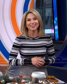 Amy Robach on Good Morning America on ABC was spotted wearing this grey striped ribbed sweater on Good Morning America on Dec 08 2020's episode. Amy's Sweater is the Panel-Stripe Metallic Ribbed Pullover Sweater by Frame.
