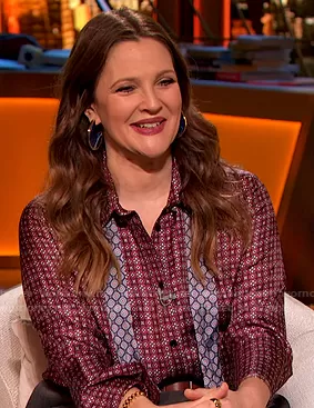 Drew Barrymore on The Drew Barrymore Show on CBS was spotted wearing this red geometric print shirt on The Drew Barrymore Show on Dec 09 2020's episode. Drew's Top is the Geometric Floral-Print Silk-Twill Shirt by Sandro . Drew's Pants is the High-Rise Wide-Leg Trousers by Alexandre Vauthier . Drew's Shoes is the Bianca knotted leather platform sandals by Saint Laurent . Drew's Earrings is the Aria Hoop Earrings by Cult Gaia.