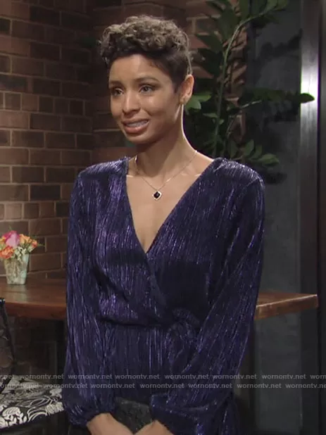 Elena Dawson (played by Brytni Sarpy) on The Young and the Restless on CBS was spotted wearing this blue metallic wrap dress on The Young and the Restless on Dec 09 2020's episode. Elena's Dress is the Melissa Long Sleeve Plissé Faux Wrap Midi Dress by Bardot . Elena's Necklace is the Kacey Pendant Necklace by Kendra Scott.