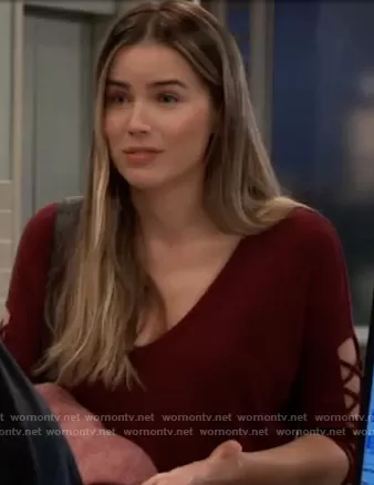 Sasha Gilmore (played by Sofia Mattsson) on General Hospital on ABC was spotted wearing this red lace-up sleeve top on General Hospital on Jul 22 2022's episode. Sasha's Top is the Lace-up top by Express.