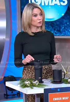 Amy Robach on Good Morning America on ABC was spotted wearing this green ribbed top and leopard print skirt on Good Morning America on Dec 10 2020's episode. Amy's Top is the Fitted Bateau Neck Top by Intimissimi . Amy's Skirt is the Relana Leopard Print Silk Skirt by Nili Lotan.