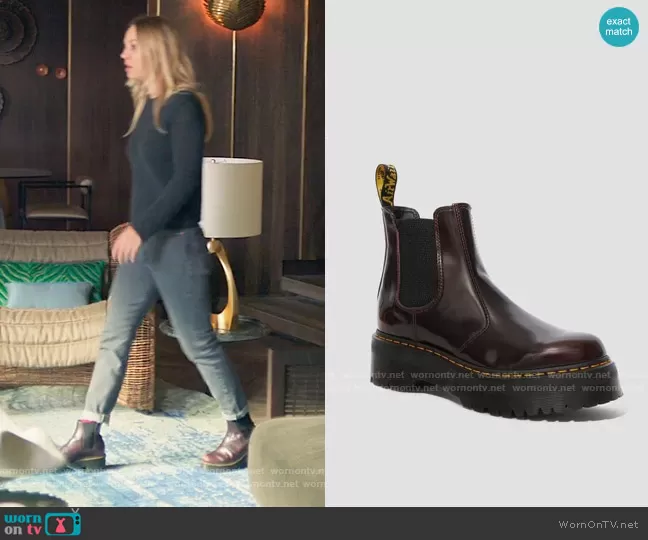 Cassie Bowden (played by Kaley Cuoco) on The Flight Attendant on HBO Max was spotted wearing this charcoal sweater and grey jeans on The Flight Attendant on episode 'Hitchcock Double' (1x07) in Dec 2020. Cassie's Shoes is the Arcadia Platform Chelsea Boots by Dr Martens.