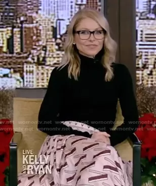 Kelly Ripa on Live with Kelly and Mark on Disney ABC Home Entertainment was spotted wearing this black sweater and pink print pleated skirt on Live with Kelly and Ryan on Dec 11 2020's episode. Kelly's Skirt is the V-print pleated skirt by Valentino.