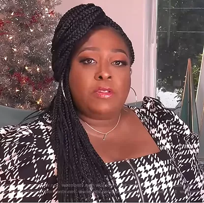 Loni Love on The Real on BETher was spotted wearing this houndstooth jumpsuit on The Real on Dec 06 2020's episode. Loni's Jumpsuit is the Houndstooth Skinny Jumpsuit by Ashley Stewart.