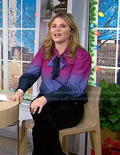 Jenna Bush Hager on Today on NBC was spotted wearing this tie neck ombre blouse on Today on Dec 14 2020's episode. Jenna's Top is the Susan Ombre Top by Tanya Taylor.