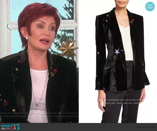 Sharon Osbourne on The Talk on CBS was spotted wearing this black velvet star embroidered blazer on The Talk on Dec 14 2020's episode. Sharon's Blazer is the Estelle Velvet Star-Embroidered Blazer by Cinq a Sept.