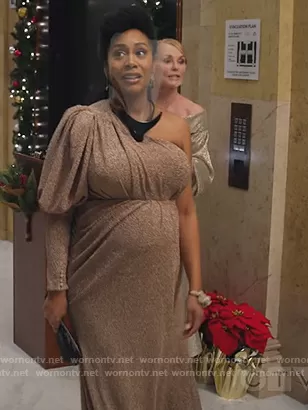 Lola Carmichael (played by Simone Missick) on All Rise on OWN was spotted wearing this metallic one shoulder gown on All Rise on episode 'The Perils of the Plea' (2x05) in Dec 2020. Lola's Dress is the One-sleeve belted ruched Lurex gown by Patbo.