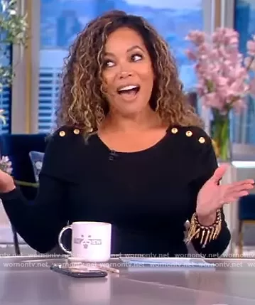 Sunny Hostin on The View on ABC was spotted wearing this black button embellished sweater on The View on Apr 27 2022's episode. Sunny's Top is the Button-embellished cotton-jersey top by Balmain.