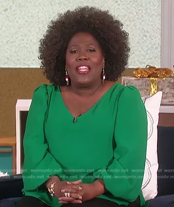 Sheryl Underwood on The Talk on CBS was spotted wearing this green puff sleeve blouse on The Talk on Dec 16 2020's episode. Sheryl's Top is the Danise Puff-Sleeve Top by Trina Turk.