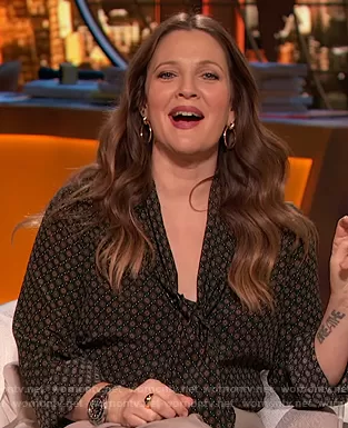 Drew Barrymore on The Drew Barrymore Show on CBS was spotted wearing this geometric print tie neck blouse on The Drew Barrymore Show on Jan 08 2021's episode. Drew's Top is the Lavalliere Blouse by Celine
