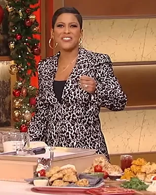 Tamron Hall on Tamron Hall Show on ABC was spotted wearing this black and white lace blazer and pants on Tamron Hall Show on Dec 17 2020's episode. Tamron's Blazer is the Lace and crepe blazer by Michael Kors . Tamron's Pants is the Brooke Bonded Lace Side-Zip Pants by Michael Kors.