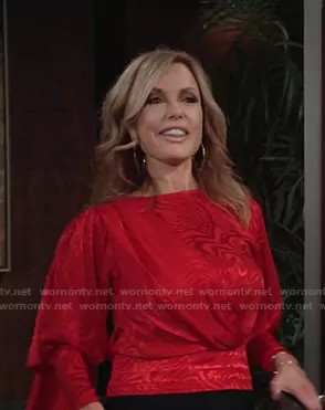 Lauren Fenmore (played by Tracey Bregman) on The Young and the Restless on CBS was spotted wearing this red jacquard draped top on The Young and the Restless on Dec 17 2020's episode. Lauren's Top is the Monet Silk Blend Jacquard Draped Blouse by Ronny Kobo.