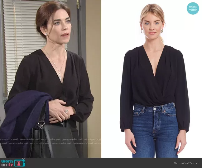 Victoria Newman (played by Amelia Heinle) on The Young and the Restless on CBS was spotted wearing this black cross front blouse on The Young and the Restless on Dec 17 2020's episode. Victoria's Top is the Crossover Bodysuit in Black by Amanda Uprichard.