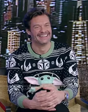 on Live with Kelly and Mark on Disney ABC Home Entertainment was spotted wearing this Star Wars Yoda Christmas sweater on Live with Kelly and Ryan on Dec 18 2020's episode. 's Sweater is the Star Wars Baby Yoda The Child Forces Trees Ugly Christmas Sweater by Ugly Christmas Sweater.