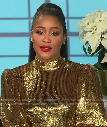 Sheryl Underwood on The Talk on CBS was spotted wearing this black studded blouse on The Talk on Dec 18 2020's episode. Sheryl's Dress is the Christy Sequin Mock-Neck Blouson-Sleeve Mini Dress by A.L.C..