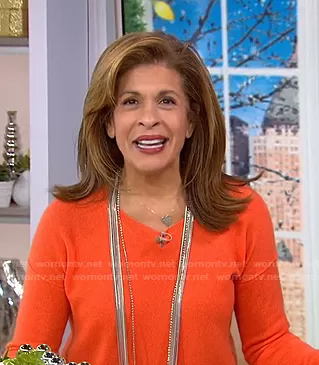 Hoda Kotb on Today on NBC was spotted wearing this orange sweater on Today on Dec 21 2020's episode. Hoda's Sweater is the High Low Cashmere Sweater by Aqua Cashmere.